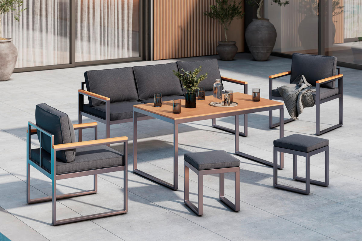Zahradní sestava - stůl, lavice, 2 křesla a 2 taburety, ocel a plast