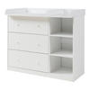 Nadčasová a moderní přebalovací jednotka vytváří příjemné prostředí pro každodenní péči a udržuje všechny důležité pomůcky přehledně uspořádané. Díky svému přehlednému designu dokonale zapadne do každého dětského pokoje a přispěje k harmonické atmosféře. Vyjímatelná přebalovací jednotka slouží jako prostorná plocha pro pohodlné přebalování s bočním vyvýšením. Ty chrání před náhodným pádem a poskytují rodičům dodatečnou bezpečnost. Komoda se třemi prostornými zásuvkami zajišťuje pořádek v každodenním životě. Plenky, oblečení a pečující prostředky zde lze snadno uložit a mít je vždy po ruce. Další úložný prostor poskytují otevřené boční police. Jsou ideální pro košíky, hračky nebo pěkné dekorace a lze je flexibilně využít. Jakmile přebalování přestane být součástí každodenního života, lze přebalovací prostor snadno odstranit. Zůstane tak komoda se snadnou údržbou, kterou lze dlouhodobě využívat mnoha různými způsoby. Významné vlastnosti výrobku: