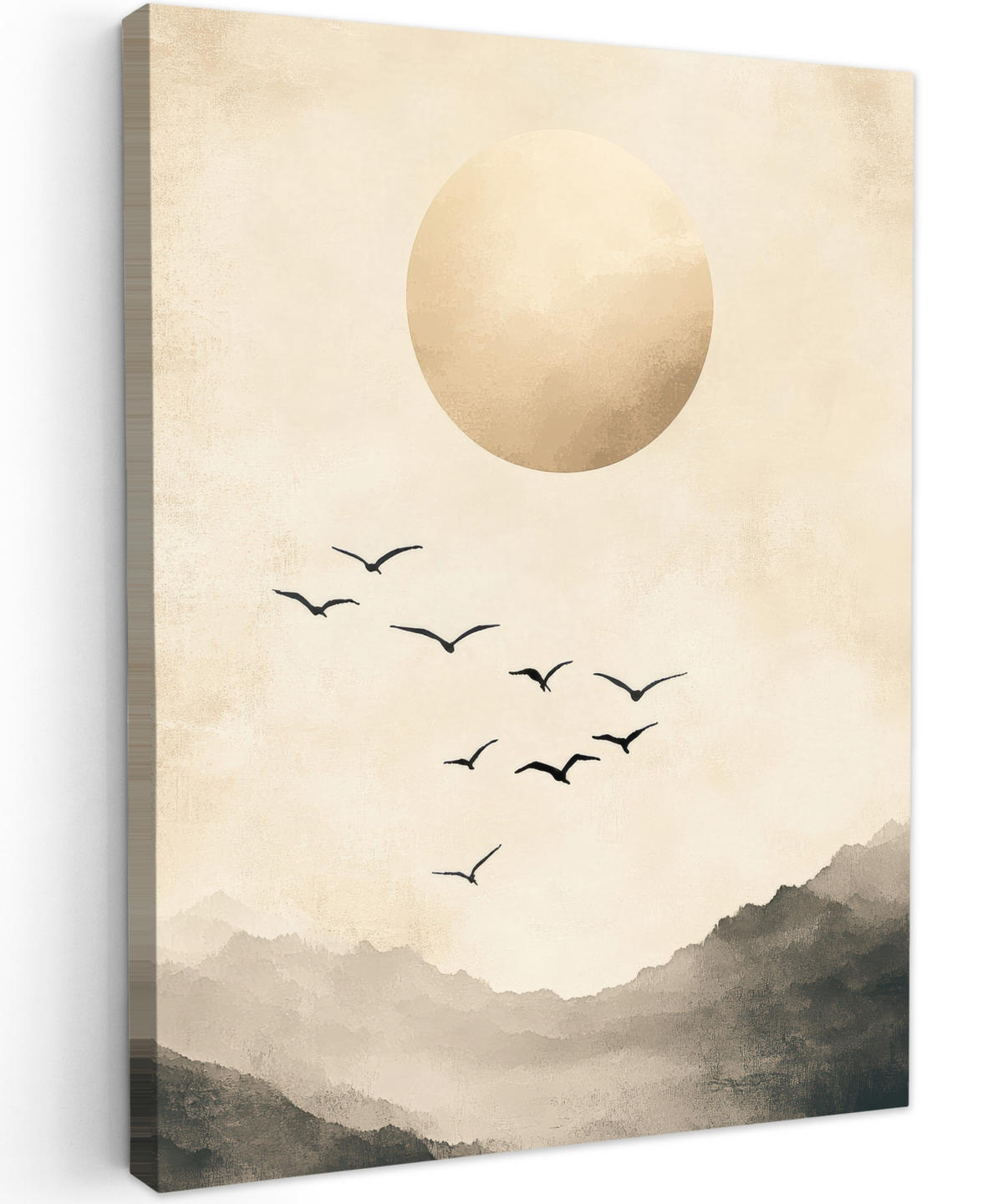 Klidná krajina se sluncem, kopci a letícími ptáky v jemných zemitých tónech.