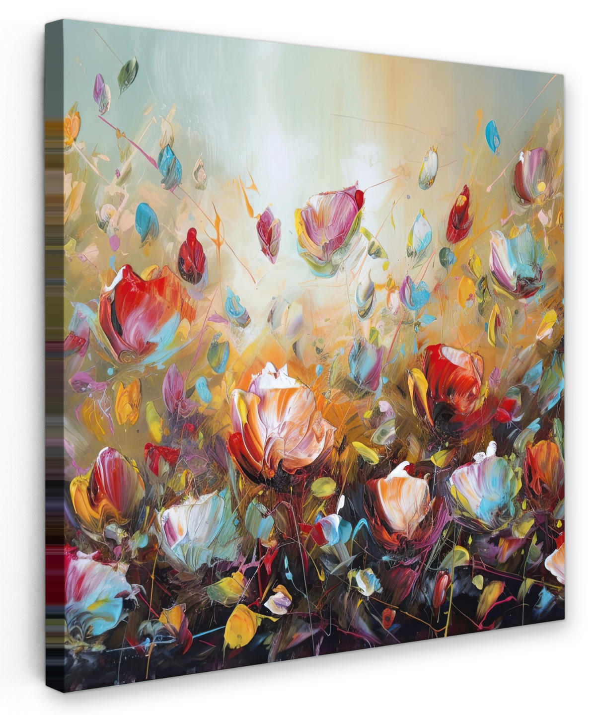 Barevná olejomalba s mnoha květinami.