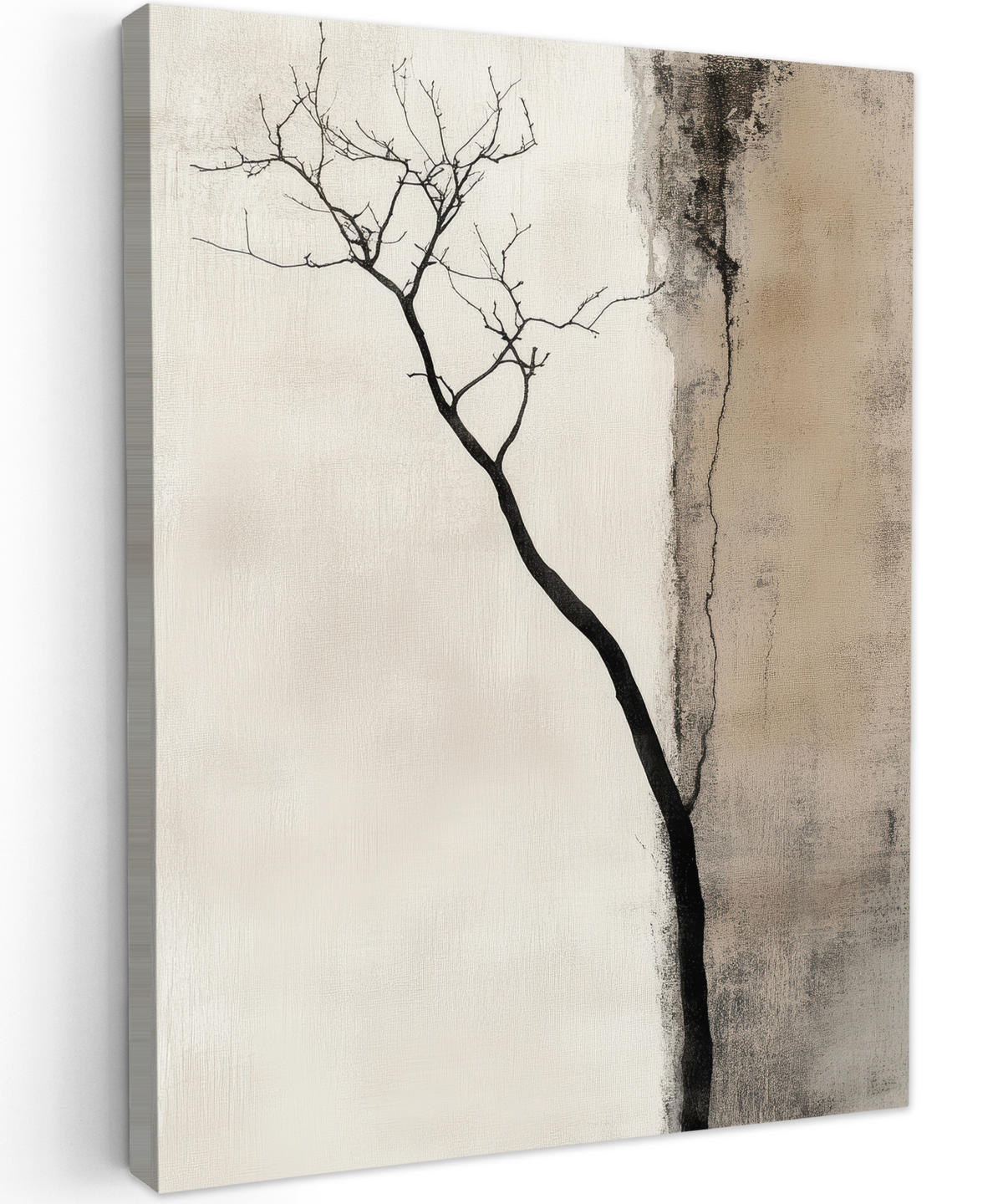V centru pozornosti je holá černá větev stromu na zvětralém pozadí s odstíny hnědé a béžové.6x