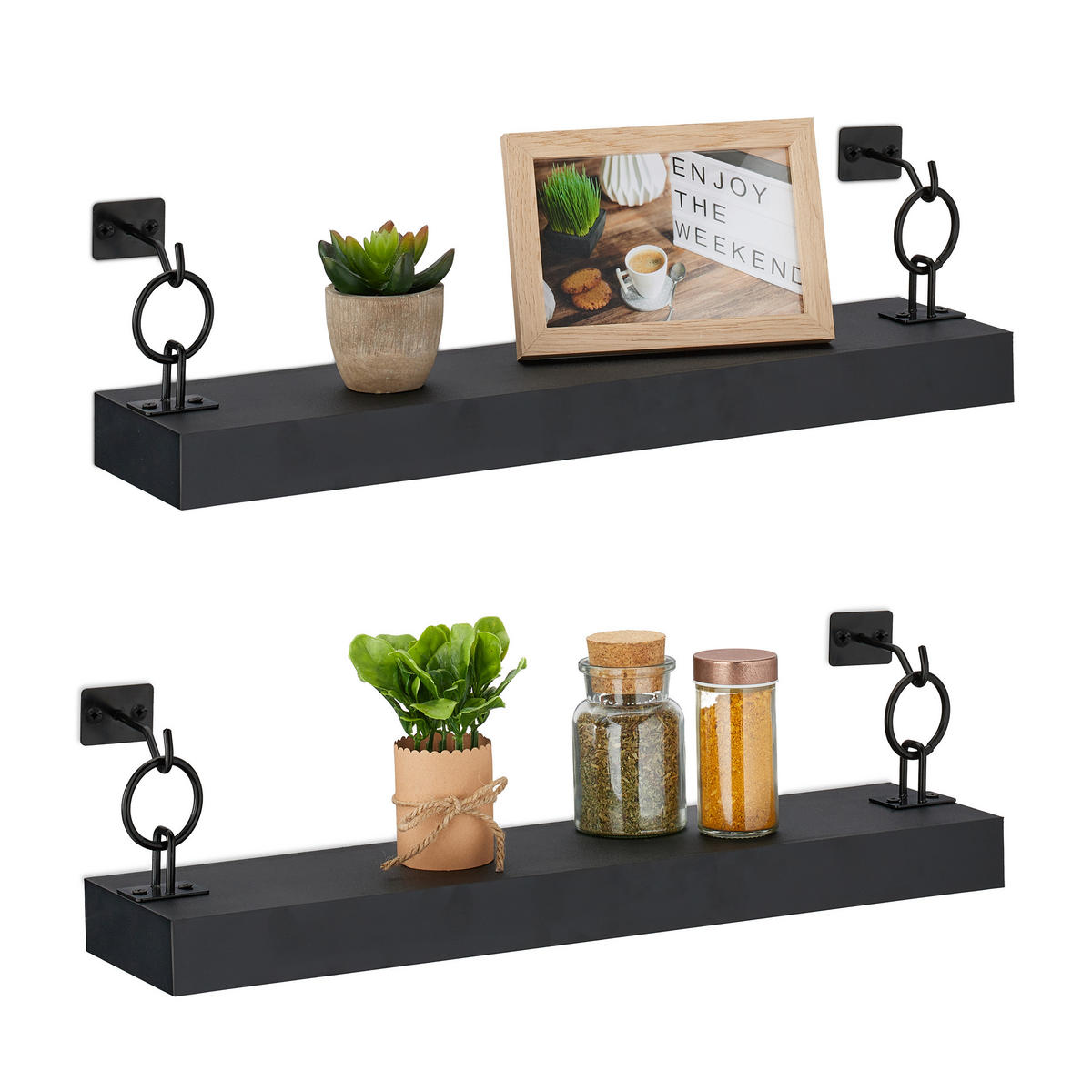 Tato nástěnná police v sadě 2 kusů vdechne prázdným stěnám v obývacím pokoji nebo ložnici nový život. Drobné rostliny, obrázky a dekorativní figurky najdou na černé polici skvělé místo na stěně a budou dekorativně vystaveny. Závěsná police se také skvěle hodí do předsíně nebo kuchyně, kde je plovoucí police ideální například na koření. Jednoduchý design nástěnné police je šikovně ozvláštněn kovovým závěsem a lze jej kombinovat s různými styly bydlení.