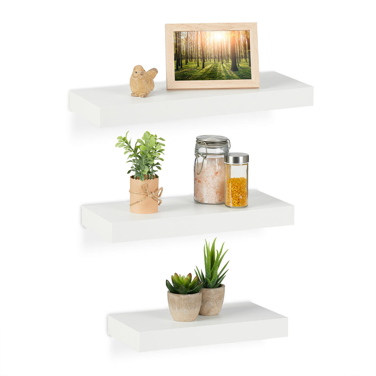 Tyto police v sadě 3 kusů vdechnou nový život prázdným stěnám v obývacím pokoji nebo ložnici. Drobné rostliny, obrázky nebo dekorativní figurky najdou díky závěsným policím skvělé místo na stěně a budou dekorativně prezentovány. Jednoduchý design v bílé barvě se skvěle hodí také do předsíně nebo kuchyně, kde jsou nástěnné police ideální například na kořenky a dózy. Díky přiloženému montážnímu materiálu lze plovoucí police připevnit na zeď během chvilky.