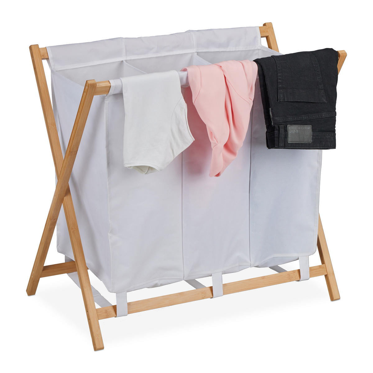 Tento moderní koš na prádlo je praktickým a dekorativním doplňkem do ložnice nebo koupelny. Tři velké přihrádky koše na prádlo usnadňují třídění špinavého prádla podle barvy nebo typu oblečení. V případě potřeby můžete flexibilní koš na prádlo také jednoduše složit a uložit, abyste ušetřili místo. Kombinace materiálů z bílé tkaniny a přírodního bambusu nenápadně zapadne do vaší domácnosti a krásně upoutá pozornost.