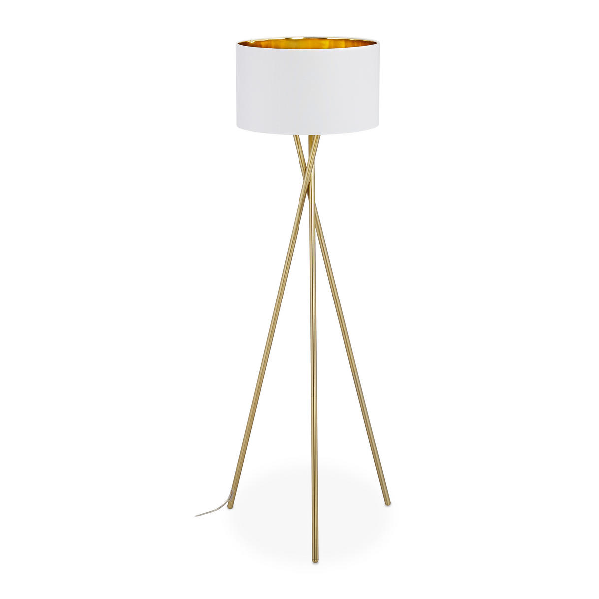 Tato elegantní stojací lampa rozzáří každou místnost. Speciální design se třemi nohami se dokonale hodí k modernímu stylu vybavení obývacího pokoje, chodby nebo ložnice. Příjemně teplé světlo může poskytovat také v kanceláři. Kovový rám ve zlaté barvě a zlatý nátěr na vnitřní straně stínidla dělají ze stojací lampy elegantní poutač na oči. Design decentně doplňuje průhledný kabel s praktickým nožním vypínačem.