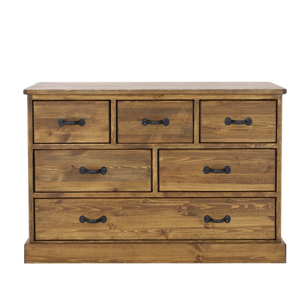 Komoda Rustyk 3/6 s devíti zásuvkami je vyrobená z masivního borovicového dřeva ve venkovském vzhledu a bezproblémově se dokáže spojit s dalším nábytkem a dekoracemi, patřící do venkovského, minimalistického i skandinávského stylu. Zásuvky jsou vložené do pevné konstrukce, která má ručně broušené a zaoblené hrany. Vrchní deska o síle 26 milimetrů společně se spodní deskou dodají komodě stabilitu a řádnou pevnost. Pro podtrhnutí krásného vzhledu byly použity kovové úchytky, díky nimž se komoda stává flexibilnější pro dekorování zbytku místnosti.