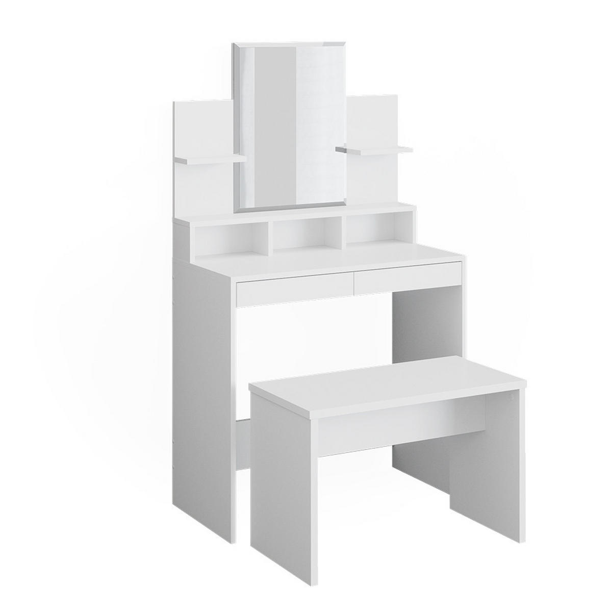 Kosmetický stůl se zrcadlem má dvě uzavřené zásuvky pro uložení kosmetických potřeb a velké obdélníkové zrcadlo pro dokonalý vzhled.