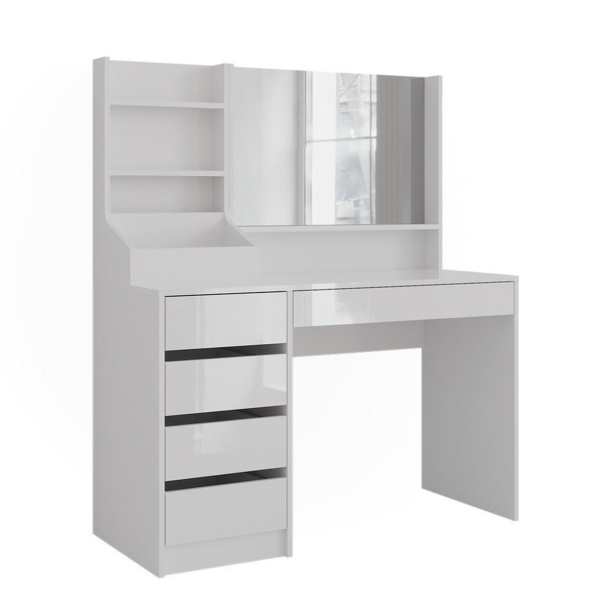 ROZSAH DODÁVKY: Toaletní stolek, nádoba se zásuvkami, zrcadlo, police, montážní návod, montážní materiál (dekorace nejsou součástí dodávky)