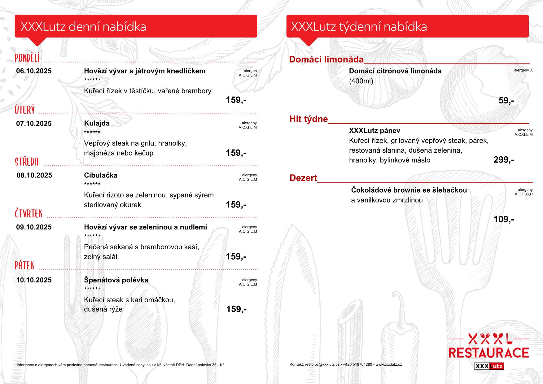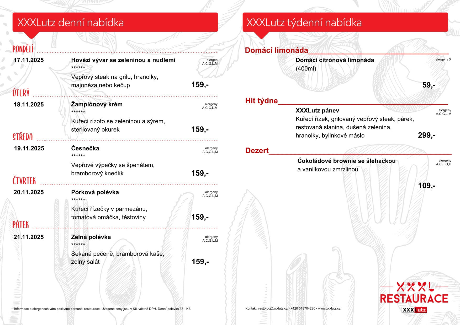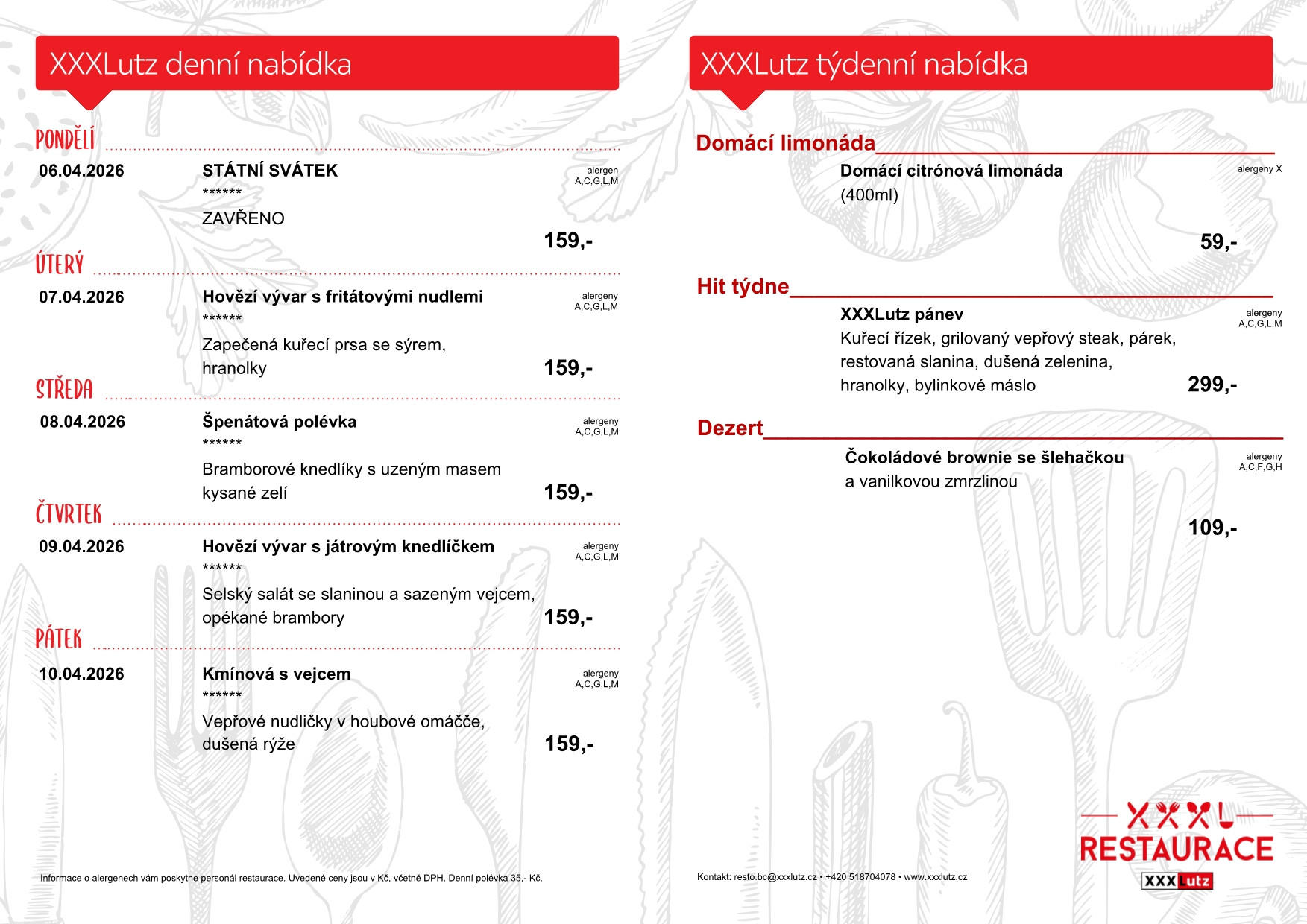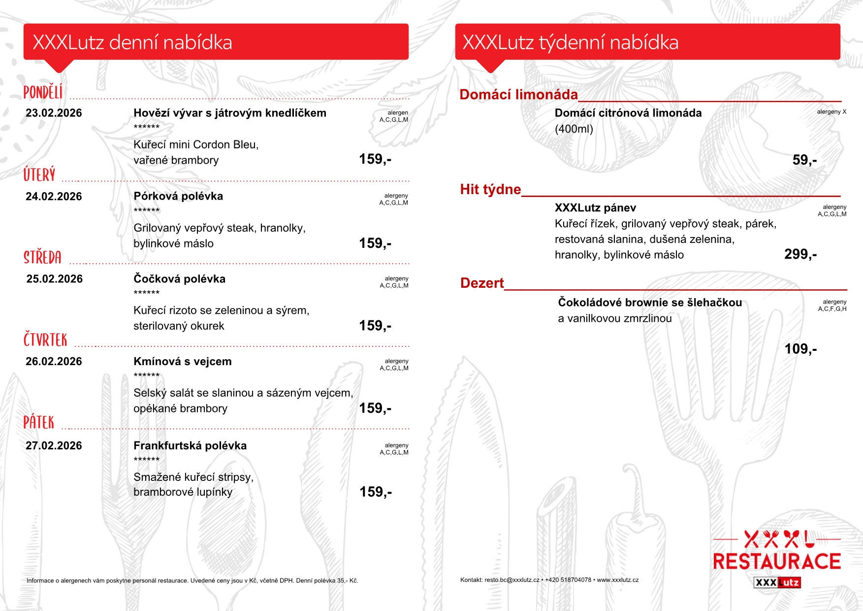 Stálé menu i extra sezonní menu! Prohlédněte si náš stálý jídelní lístek, ve kterém najdou to své milovníci masa i vegetariáni. Nebo se rovnou zastavte v některé z našich XXXL restaurací a ochutnejte také čerstvé sezonní pokrmy, které pro vás naši kuchaři připravují v každém ročním období. Dobrou chuť!